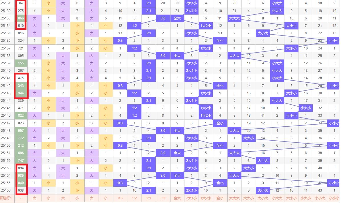 大小走势分析: 在152期开奖号码638大小号码的比例为2:1,大号占据优势。从近期开奖的历史数据来看,大小号码的分布呈现出相对均衡的趋势。因此,在157期的开奖中,可以预期大小号码的比例将继续保持均衡,大小比可考虑为1:2或2:1。这一判断基于对当前走势的深入分析,旨在为彩民提供更为精准的投注参考。
