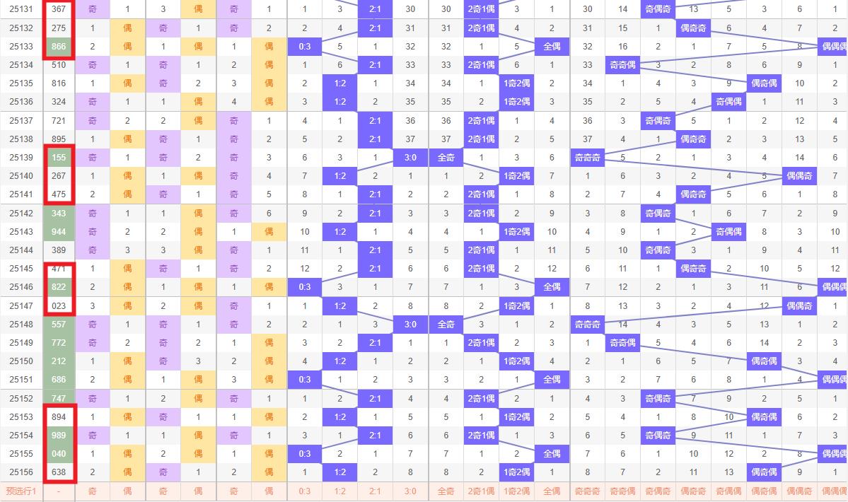 奇偶比例分析 156期开奖中,奇偶号码的比例为1:2,偶号占据优势。考虑到奇偶号码在历史开奖中的交替出现规律,可以合理推测,在157期的开奖中,奇偶号码的比例也将趋于均衡。因此,本期可重点关注奇偶号码的均衡走势,奇偶比同样可考虑为1:2或2:1。这一分析旨在帮助彩民更好地把握奇偶号码的分布规律,提高投注的准确性。