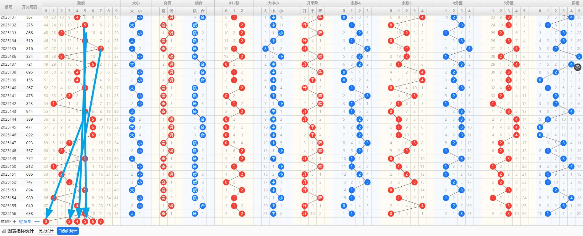 跨度预判: 156期的开奖跨度为5。根据跨度走势图的分析,可以发现,近期开奖的跨度值在中路范围内波动较为频繁。因此,在157期的开奖中,可以重点关注中路跨度的表现,重点跨度值可考虑0.3.4.5.6.7.这一预判旨在捕捉跨度值的波动规律,为彩民提供更为精准的跨度投注建议。