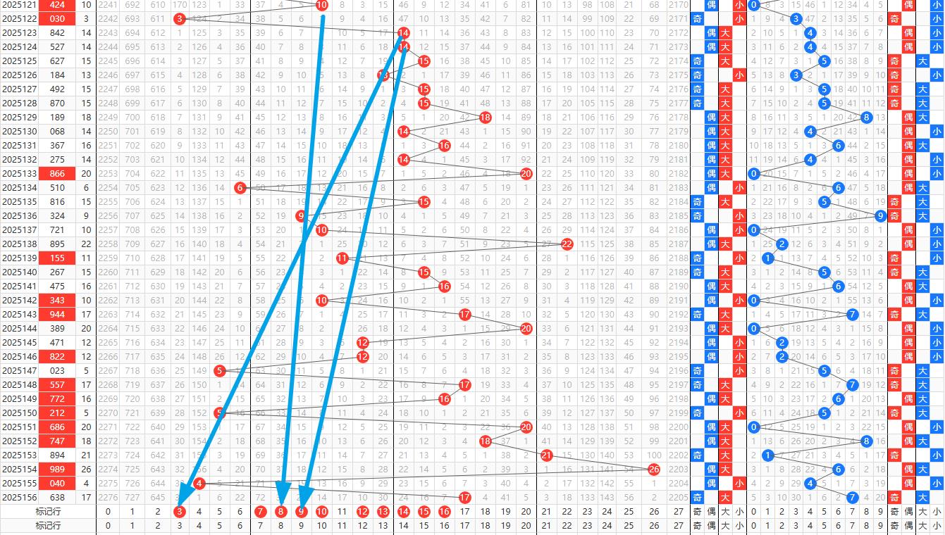 和值预判 :156期的开奖和值为17。大和值、012路和值等因素的分析,可以得出,在157期的开奖中,和值有望在3至16的范围内波动。因此,本期重点和值可考虑3.7.9.10.12.13.14.这一预判旨在帮助彩民更好地把握和值的分布规律,提高投注的命中率。