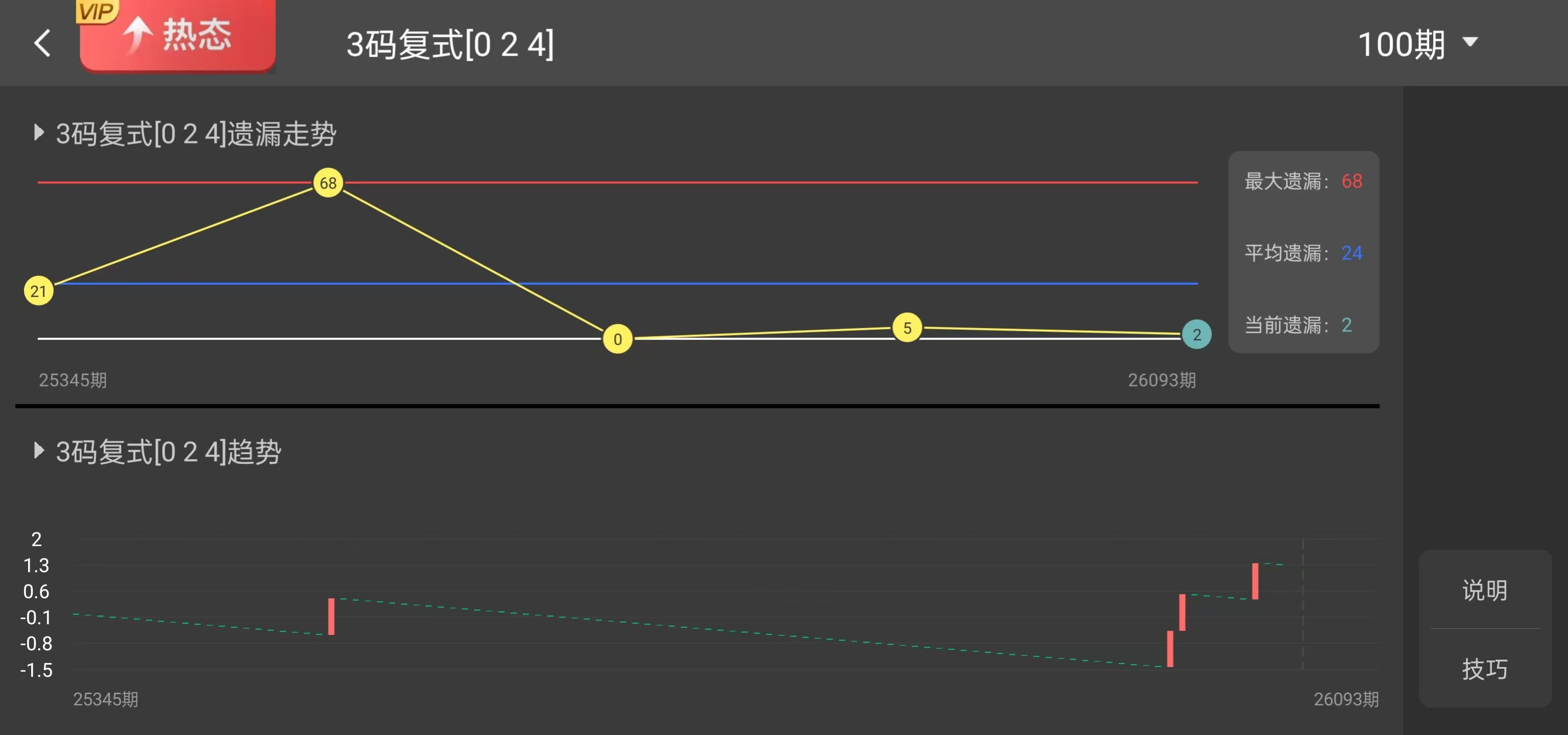 跨度走向:近 9 期跨度波动明显,上期开出 1 的极限小跨度,跨度收缩至极致后,下期跨度大概率出现明显扩张,偏向中大跨度区间运行,极小跨度的延续性较弱。