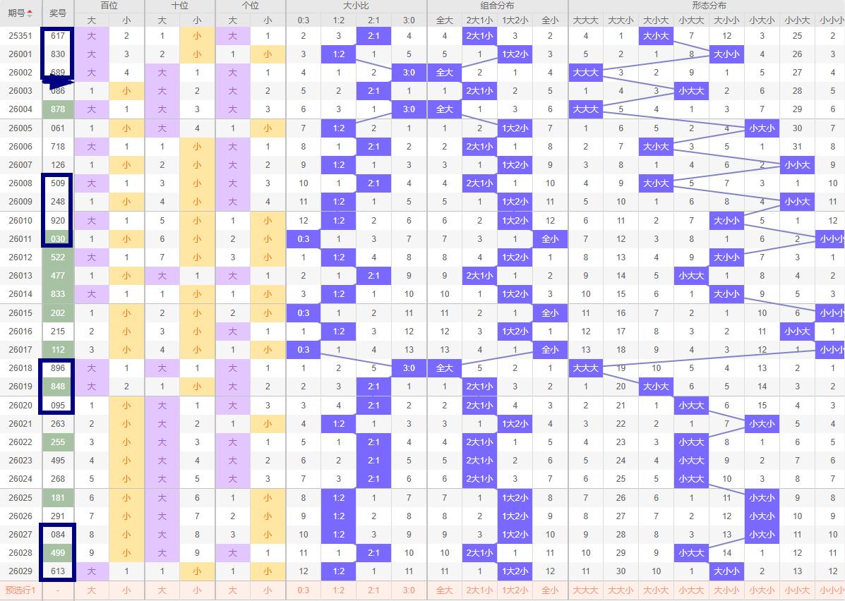 大小走向分析: 在排列3中,大小走势是判断号码分布的重要依据。根据029期开奖结果613.,大小比为1:2;形态偶奇奇。结合历史走势图,发现近10期大小比例为15:15,大数与小数持平;因此,030期关注的大小比例1:2或2:1,应充分考虑这一趋势,合理分配选号比例。防组三