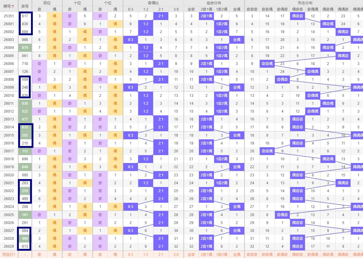 奇偶比例分析 奇偶比例同样是排列3分析中的重要一环。029期开奖号码为613..奇偶比为2:1,即2个奇数和1个偶数。从近期走势图来看,奇偶比例分布较为均衡,没有出现明显的偏态。因此,030.期可以继续关注1:2或者2:1的奇偶比例。可以根据这一比例进行号码筛选。