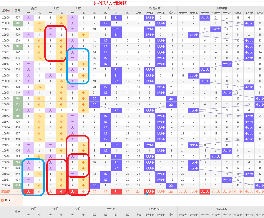 上一期012路个数比为2:1:0,是01路的号码组合,上期断掉2路的号码,本期的号码以两路的组六组合号码为主,本期2路的号码可能会出现,本期应该会有0路的号码,本期以02的组六组合号码为主,防12路和01路的组合,侧重02路的号码组合