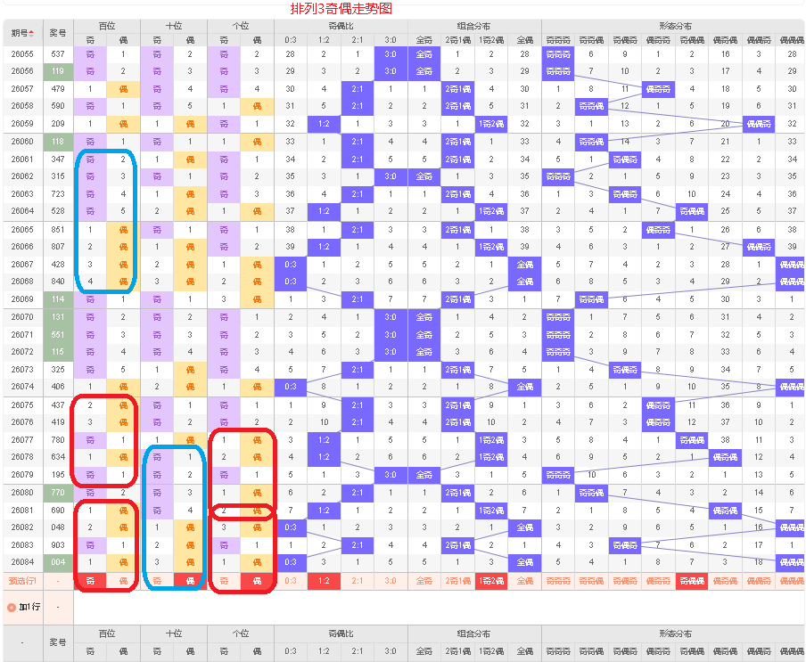 上一期的奇偶比为0:3,全偶的号码组合,从近五期的奇偶数出现情况看,奇数出5次,偶数出现10次,奇数号码出现较少,本期要侧重两偶的号码组合,侧重奇偶偶或奇偶奇的号码组合,根据奇偶组合形态可做五码定位13579/02468/02468或13579/02468/13579