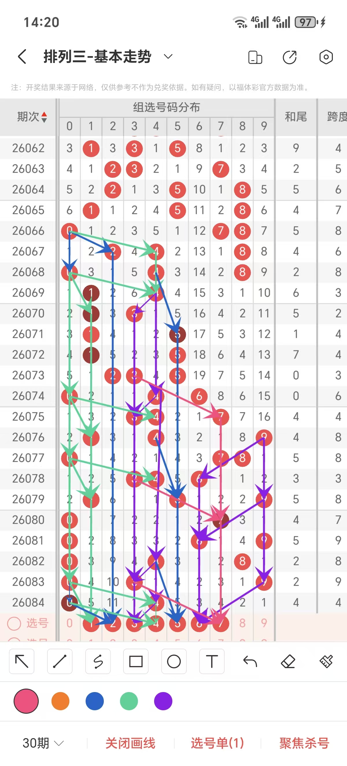 通常情况下在五期之内重复一个跨度的概率较高,近五期重复了9的跨度,近五期跨度为7/9/8/9/4,近期01路的跨度较热,本期要侧重3/4/6跨为主的号码组合。选择好跨度就可以从跨度方面选择相应的双胆码组合,双胆码的选取要根据近期和历史的走势进一步的分析选取。