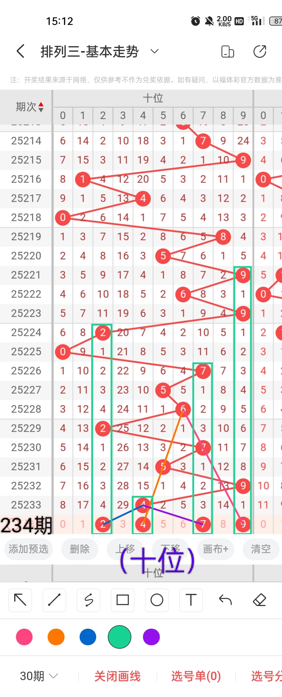 我们根据图中画线的思路可以看出,号码2与前几期开出的号码呈斜连的走势且呈连续隔四期回补的走位,跨度为2;号码4与前几期开出的号码呈斜三连的走位且呈直连回补的走势,跨度为0;号码7与前几期开出的号码呈斜连的走势且呈连续隔三期回补的走位,跨度为3;号码9与前几期开出的号码呈隔期回补前后相互对称的走位且呈斜三连的走势,跨度为5。综上所述,小梁推荐十位的号码为2、4、7、9。