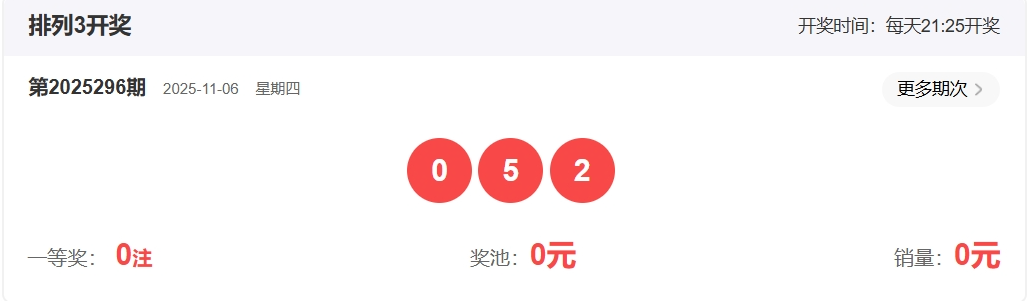 排列三第2025296期开奖回顾:开奖号码:052   形态:组六