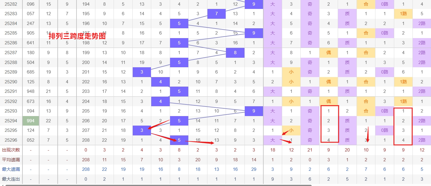 排列三 跨度分析:从上图可以看出近100期的跨度大小比约为54比46,跨度奇偶比约为48比52总体来看还是比较均衡的,但跨度大小之间有点差异。我们再从历史开出5跨后下一期6跨度数据来做参考。最近10期跨度大小比约为5:5期开出小数跨度过多返回大数跨度的概率更高一点。历史开奖近2期出5跨以后的走势为212期开出5跨后下一期走8跨走出3振幅,第224期开出5跨后下一期走2跨走出3振幅第237期开出5跨后下一期开出6跨走出1个振幅。连续多期小振幅。排列三近期跨度走势的跟踪分析,2跨和7跨已持续多期未见开出,遗漏值均攀升至相对高位,呈现出明确的冷态特征。从概率均衡与冷热转换的规律来看,当某个跨度长期遗漏后,其回补的动能会不断累积;当前2跨与7跨同时进入冷态区间,这种双冷格局往往预示着较强的回补潜力。历史数据也显示,类似跨度的冷极反弹现象屡见不鲜,尤其在遗漏周期达到临界点后,通常会在短期内迎来触底回升。综合以上分析后得出,本期预计跨度遵从历史会走出小振幅,出5跨度后容易走出2到4个跨度振幅的对称形态,跨度走出2到4个振幅看好的跨度有2678跨,所以第2025297期排列三跨度推荐2678跨。本文由一起彩钱是生命动力所著,请勿转载