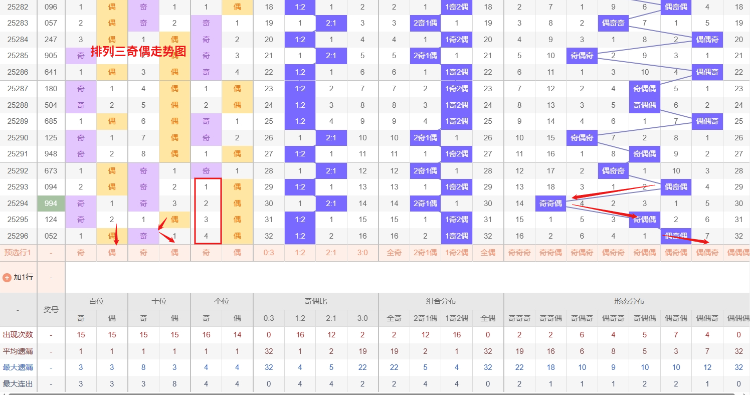 排列三 奇偶分析:从上图可以看出排列三100期内百位奇偶比约为46比54,十位奇偶比为47比53,个位奇偶比为49比51,个位的比值比较均衡,但是百位的比值偏差就有点大,历史奇偶形态近2期开出偶奇偶后下一期的走势为,第214期开出偶奇偶后215期开偶偶奇, 第226期开出偶奇偶后第227期开偶奇奇,第233期开出偶奇偶后第234期开偶偶偶,排列三近期奇偶走势的详细追踪,目前“偶偶奇”组合正处于热出阶段,表现相当活跃。而与之形成鲜明对比的是,“偶偶偶”这一全偶组合已持续遗漏长达32期,远超过其理论出现周期,进入了明显的冷态区间。从概率均衡的角度分析,这种极端冷态难以长期维持,随着遗漏值的不断攀升,其回补的动能也在持续积累。全形态组合虽然理论上周期较长,但一旦遗漏超过一定界限,其触底反弹的可能性将显著增加。因此,在关注“偶偶奇”这类热号持续性的同时,须高度重视“偶偶偶”全偶组合可能出现的冷号回补,所以排列三2025297期奇偶形态推偶偶奇与偶偶偶。本文由一起彩钱是生命动力所著,请勿转载
