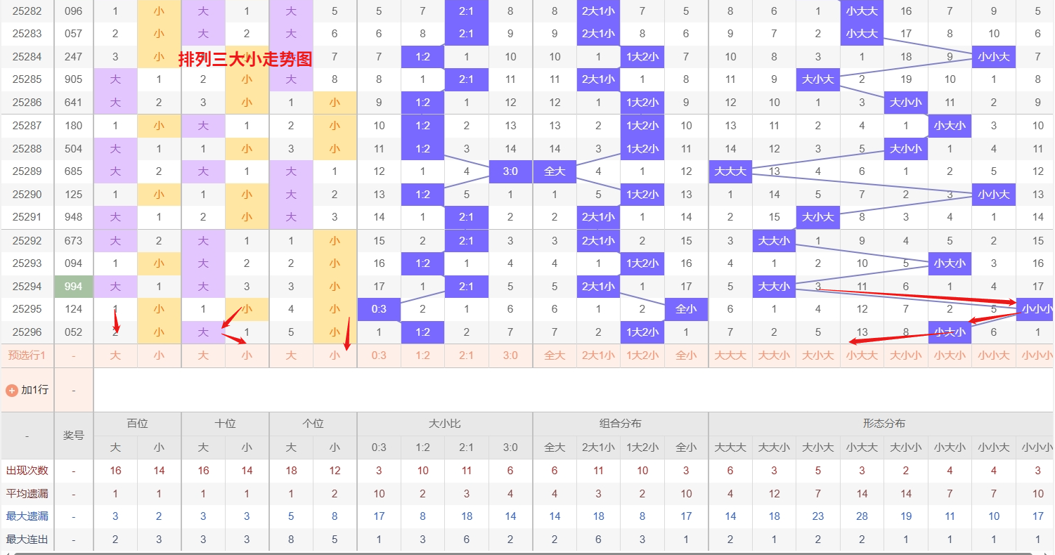 排列三 大小形态分析:从大小走势图上可以看出排列三100期内百位大小比约为49比51,十位大小比约为47:53,个位大小比约为55比45,除了个位奇数比偶数多,十位和百位是偶数比奇数多。历史数据近2期开出小大小下一期的走势为,第214期开出小大小第215期开大小小。第222期开出小大小后第223期开大大小,第237期开出小大小后238期开大小大。排列三近期大小走势的跟踪分析,目前“大小小”组合已持续遗漏较长时间,明显处于冷态区间,从概率均衡的角度看,此类冷态组合随着遗漏值的增长,其回补的动能正在不断累积,近期出现反弹的可能性逐渐增大。与此同时,“大小大”组合正呈现热出态势,作为当前的热门形态,其强劲势头短期内仍有延续的可能,在关注冷号回补的同时必须对其保持警惕。综合采取“追冷防热”的双轨策略,在重点关注“大小小”冷号回补机会的同时,合理防范“大小大”热号的持续表现,所以排列三第2025297期大小形态推荐大小小大小大本文由一起彩钱是生命动力所著,请勿转载