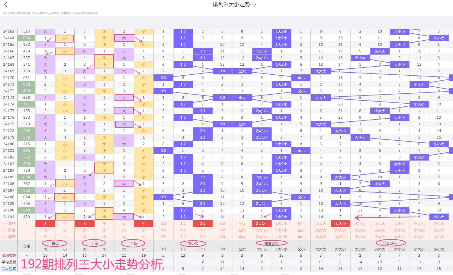 大小走势,在30期内出现次数比例17比13,最大遗漏数据比例3比5,最大连出数据比例5比3,平均遗漏数据比例1比1,近期大小小大小走势出现,数据分析,大走势可能再交替出现。