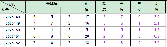 2025148期开奖号码557,我们可以看出近30期百位5出现3次,十位5出现2次,个位7出现5次。