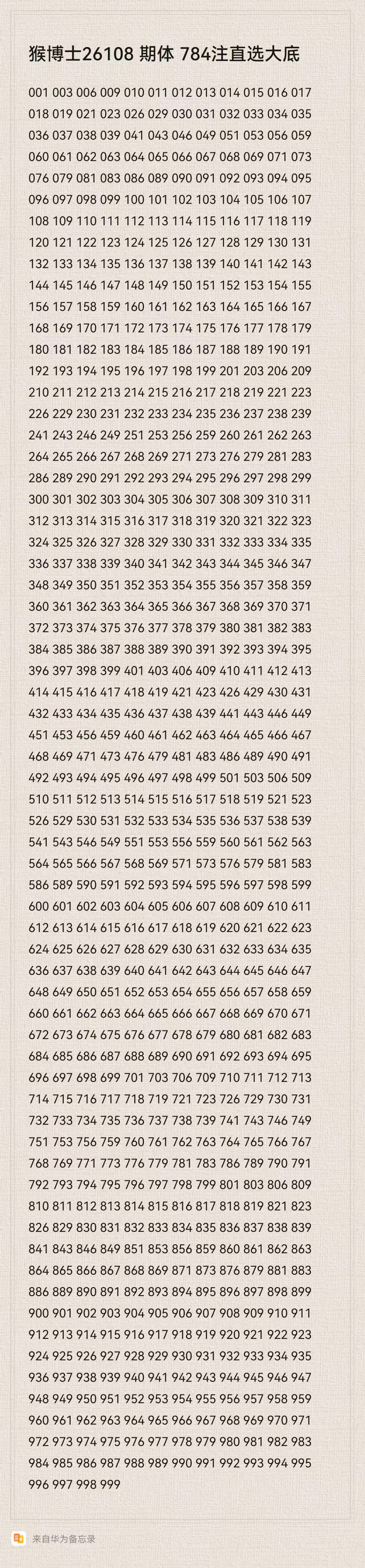 猴博士26108期排列三784注直选大底:(可以当母底用,然后进行缩水)