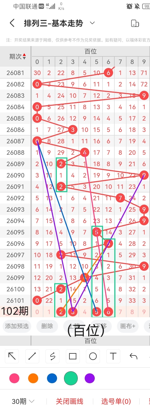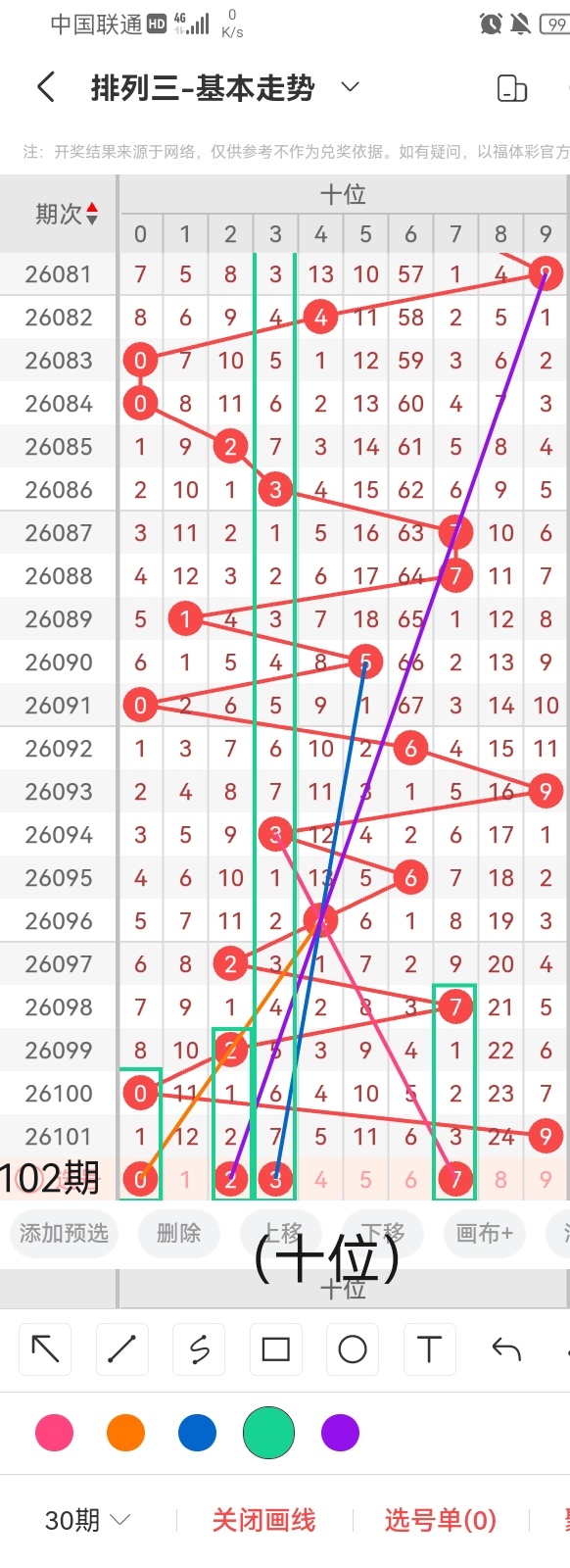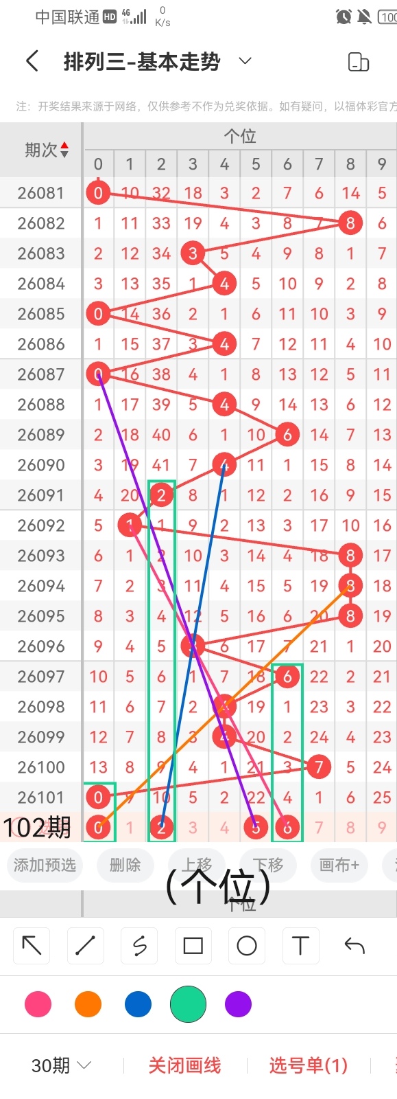 我们根据上图中画线的思路走势分析,号码0与前几期开出的号码呈斜三连的走位且呈直连回补的走势,跨度0;号码2与前几期开出的号码呈斜三连的走势且呈隔十期回补的走位,跨度是2;遗落22期未出的号码5与前几期开出的号码呈斜四连的走势,跨度5;号码6与前几期开出的号码呈斜四连的走势且呈隔四期回补的走位,跨度为6。综上所述,小梁推荐个位的号码是:0、2、5、6。