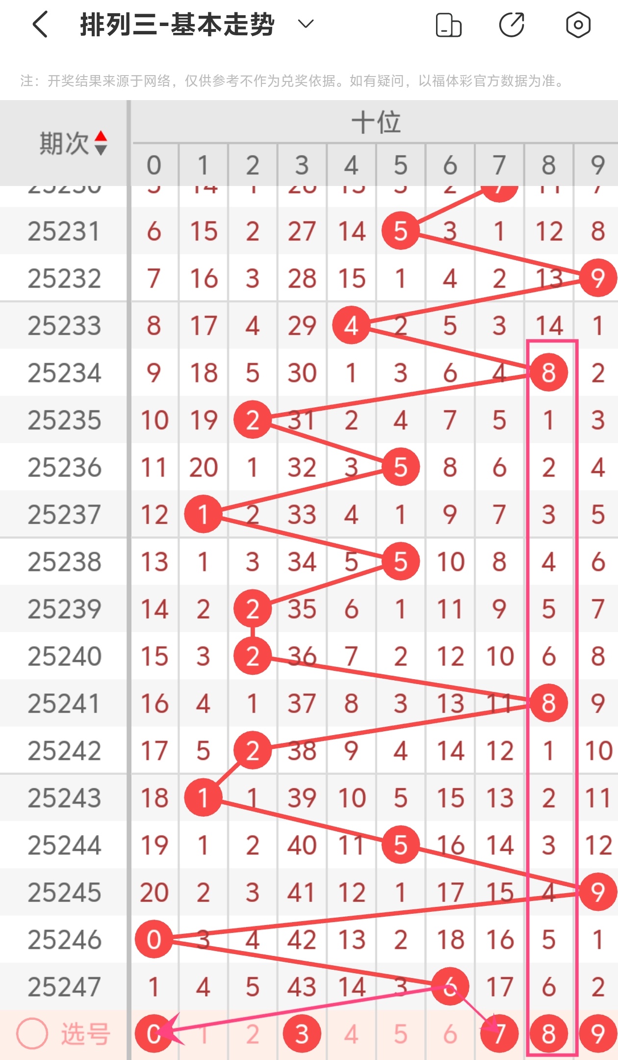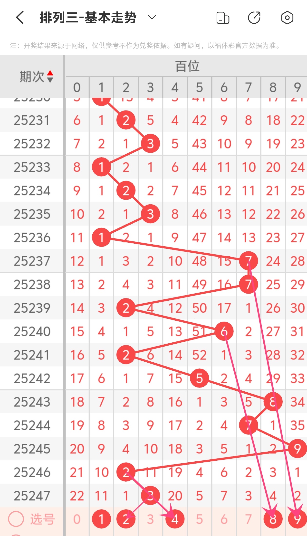 上期百位开出3,本区与上期的跨度为1,本期我们可以从上面走势图中看出选号的思路,2为隔期回补走势,4为斜三连走势跨度为一,8为斜连走势跨度为五,9为斜连走势跨六,综合以上分析,本期百位推荐:12489