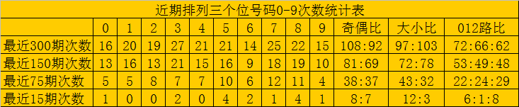 最近15期奖号由冷到热表现为:0、9→0次,5、8→1次,1、3、4、6、7→2次,2→3次,奖号奇偶比为7:8,大小比为6:9,012路比为4:6:5。