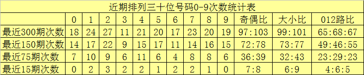 最近150期奖号由冷到热表现为:9→11次,3、4→12次,0→13次,5→15次,8→16次,2、6、7→17次,1→20次,奖号奇偶比为75:75,大小比为76:74,012路比为53:49:48。