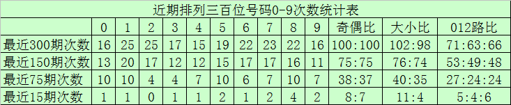 百位分析:最近300期奖号由冷到热表现为:0→21次,4→26次,3→27次,9→28次,5、6→30次,2→32次,8→33次,7→35次,1→38次,奖号奇偶比为158:142,大小比为156:144,012路比为106:99:95。