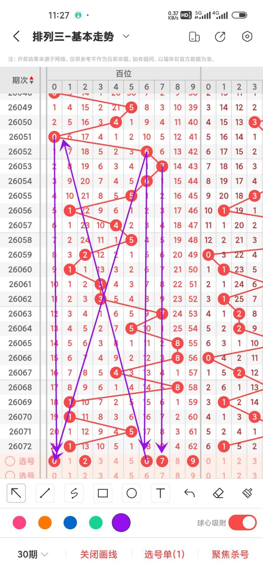 2026073期,上期个位开出奇数5,我们从500期,走势图来分析012路下号和最大遗漏数据,目前0路开出189次,1路开出156次,2路开出155次,通过走势我们可以看出在500期内大号开始回补。重点关注大号防小号回补,,在从遗漏方面看。0路遗漏总数是179,再来看1路遗漏总数是97,在回过头来看2路号码遗漏总数是123,目前遗漏方面遗漏最大的是0路号码179次,通过上面的走势分析我们可以看出,目前个位在冷号阶段的是269,在热号状态的是奇数可以作为防守防,防小号继续下号,重点关注02469,具体看走势图