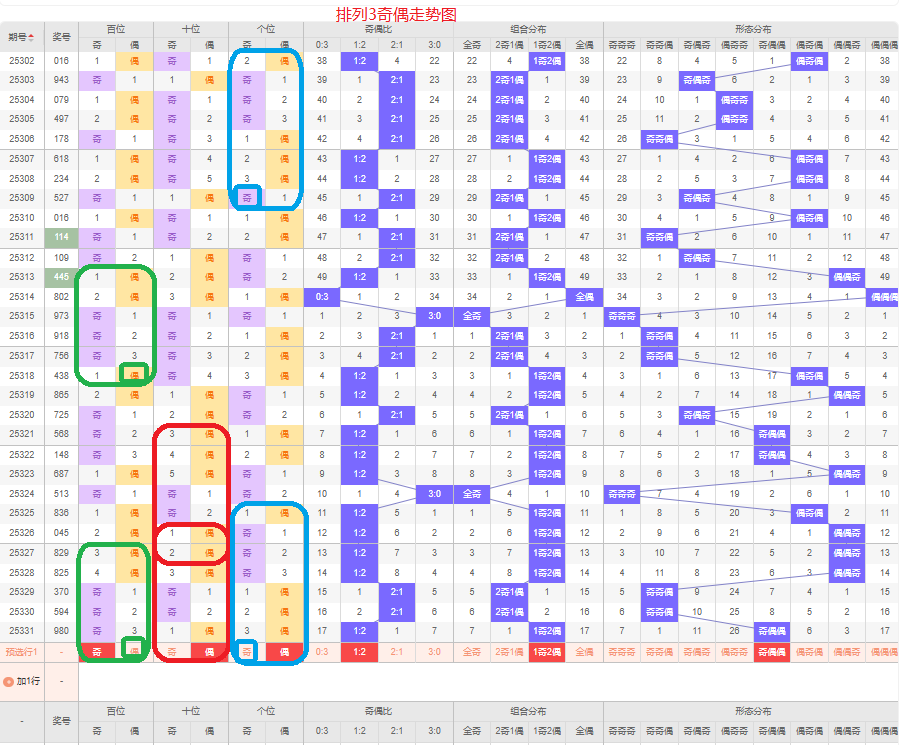 上一期的奇偶比为1:2,两偶的号码组合,从近五期的奇偶数出现情况看,奇数出7次,偶数出现8次,奇数偶数号码出现较平均,本期要侧重两偶的号码组合,侧重奇偶偶或奇偶奇的号码组合,根据奇偶组合形态可做五码定位13579/02468/02468或13579/02468/13579