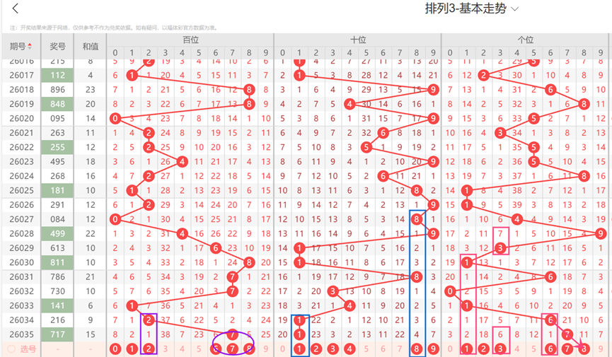 体彩排列3-第036期定位分析如下: