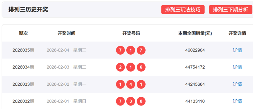 体彩排列3上一期,开奖号码为717,形态为组三,奇偶比为3:0,012路数值表现为111,和值15,和尾5,跨度6。