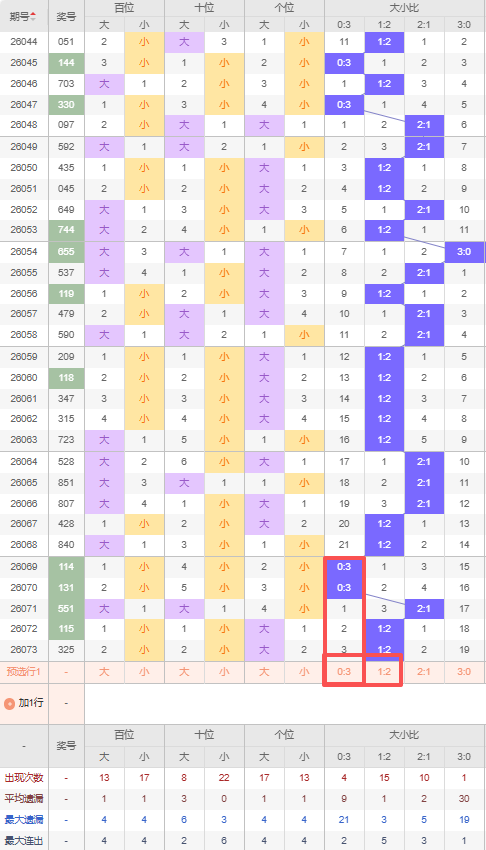 上期大小比:1:2,近10期大小比出现情况:2:1、2:1、2:1、1:2、1:2、0:3、0:3、2:1、1:2、1:2,最近10期出4期2:1,出现4期1:2,出现2期0:3,出现0期3:0,根据近10期出号规律本期推荐三连出的1:2,防遗漏3期出0:3,综上所述大小比推荐:防:0:3,重点关注:1:2。