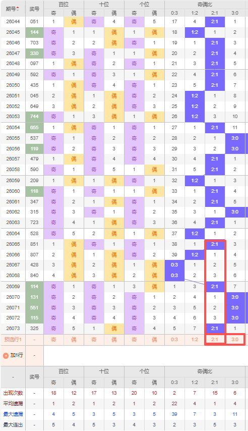 上期奇偶比:2:1,近10期奇偶比出现情况:1:2、2:1、1:2、0:3、0:3、2:1、3:0、3:0、3:0、2:1,最近10期出现3期2:1,出现2期1:2,出现2期0:3,出现3期3:0,根据近10期出号规律本期推荐隔期的3:0,防连出2:1,综上所述奇偶比推荐:防:2:1,重点关注:3:0。