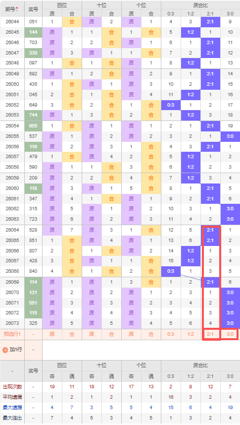 上期质合比:3:0,近10期质合比出现情况:2:1、2:1、1:2、1:2、0:3、2:1、3:0、3:0、3:0、3:0,最近10期出现3期2:1,出现2期1:2,出现1期0:3,出现4期3:0,根据近10期规律本期推荐五连出3:0,防遗漏四期出2:1,综上所述质合比推荐:防:2:1,重点关注:3:0。