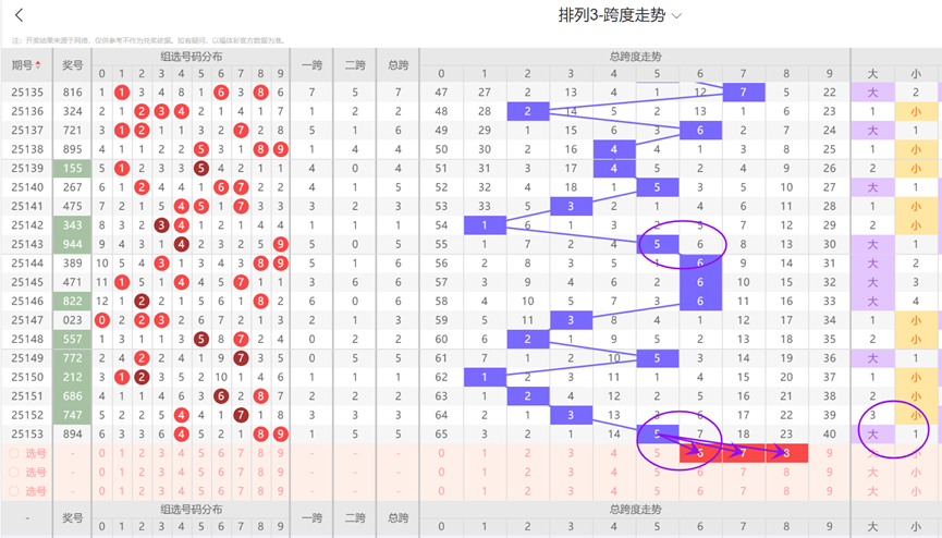 通过观察跨度及跨度属性走势可以发现:近10期内跨度大数号码出号后,下期容易连开大数号码,上期跨度开出了大数号码5,本期跨度大概率仍会开出大数号码,因此本期跨度应该考虑大数号码出号;再结合上述走势图看,本期跨度看好678等号码。