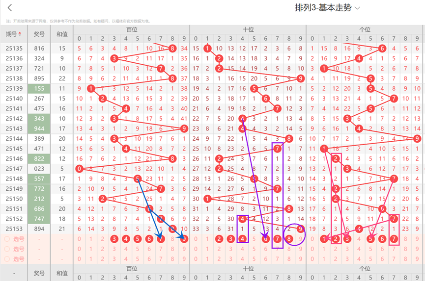 上一期百位开出号码为8,为偶数、大数、合数、2路号码:近10期百位较少开出01等号码,本期百位大概率仍然不会开出01等号码,因此本期百位选号时应该考虑01以外的号码出号,结合上述走势图看,本期百位看好345679等号码。