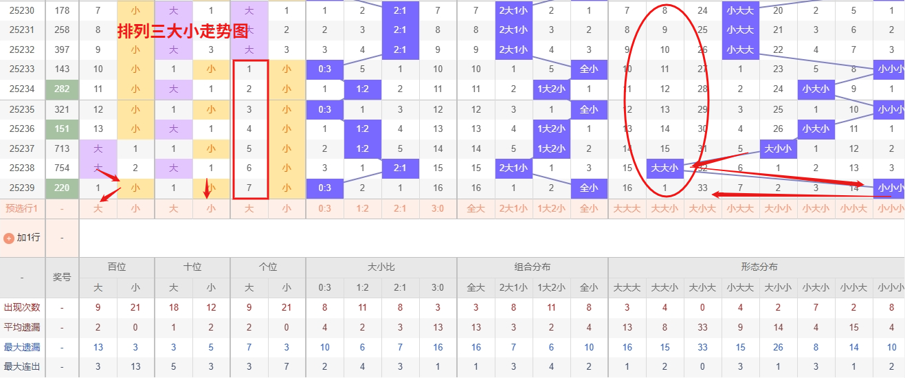 排列三 大小形态分析:从大小走势图上可以看出排列三100期内百位大小比约为48比52,十位大小比约为47:53,个位大小比约为54比46,除了百位和十位奇数比偶数多,个位是偶数比奇数多。历史数据近2期开出小小小下一期的走势为,第155期开出小小小第156期开大大大。第167期开出小小小后第168期开大大大,第175期开出小小小后176期开小大小。近期排列三大小走势中小数持续强势开出,热度集中明显,但根据概率均衡特性,大数已逐渐积累回补动能,需警惕其短期内反弹的可能性。值得注意的是,“大小大”组合目前已遗漏33期未出,处于深度冷态,历史最大遗漏值临近时往往具备较强的回补潜力,值得重点防守。同时“大大大”组合近期虽未形成热势,但出现频率有稳步提升迹象,已从冷号区间过渡至温号状态,这类组合在温号阶段常伴随短期密集开出,存在转热可能,需提前布局防范。整体来看,大小走势仍以小数为短期主导,但大数回补需求显著,冷温组合的转换需格外警惕,所以排列三第2025240期大小形态推荐大大大大小大本文由一起彩钱是生命动力所著,请勿转载