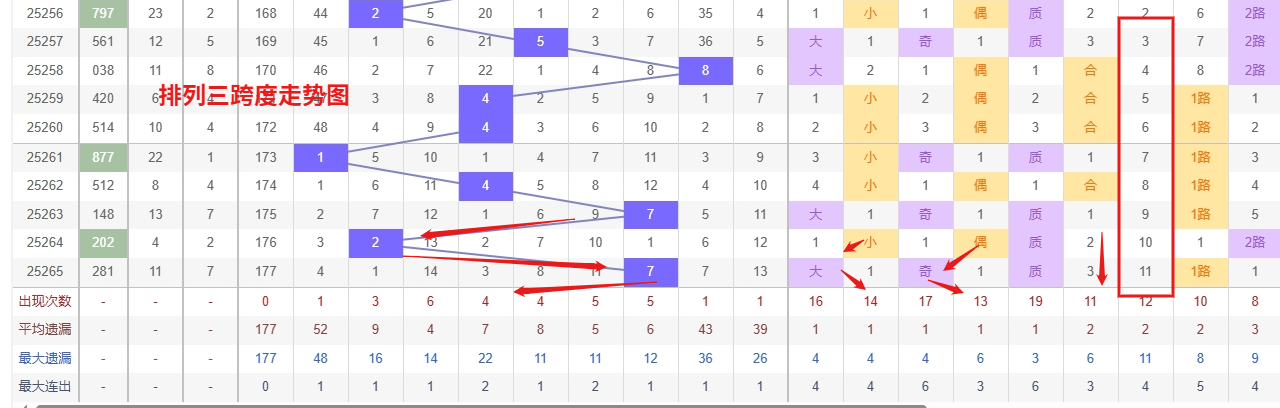 排列三 跨度分析:从上图可以看出近100期的跨度大小比约为48比52,跨度奇偶比约为55比45总体来看还是比较均衡的,但跨度大小之间有点差异。我们再从历史开出7跨后下一期3跨度数据来做参考。最近10期跨度大小比约为5:5期开出小数跨度过多返回大数跨度的概率更高一点。历史开奖近2期出7跨以后的走势为182期开出7跨后下一期走4跨走出3振幅,第192期开出7跨后下一期走3跨走出4振幅第206期开出7跨后下一期开出6跨走出1个振幅。连续多期小振幅。近期排列三跨度走势观察,呈现出鲜明的“冰火两重天”态势:一边是8跨持续走冷,遗漏期数不断拉长,俨然已成为一个亟待回补的冷号,其反弹动能正在积蓄;而另一边,3跨却异常活跃,频繁开出,展现出强劲的热出势头。这种极端的冷热分化格局需要高度警惕,因为热号“连下”与冷号“逆袭”往往是走势中常见的变盘信号。一方面,必须严防3跨凭借其当前的热度顺势再次开出,实现连庄;另一方面,8跨作为深度冷号,其任何一次回补都可能导致走势中断。综合以上分析后得出,本期预计跨度遵从历史会走出小振幅,出7跨度后容易走出1到4个跨度振幅的对称形态,跨度走出1到4个振幅看好的跨度有4368跨,所以第2025265期排列三跨度推荐4368跨。