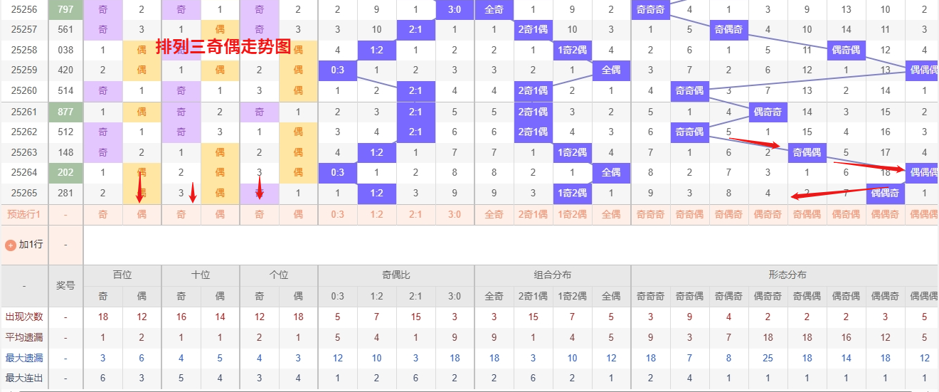 排列三 奇偶分析:从上图可以看出排列三100期内百位奇偶比约为52比48,十位奇偶比为47比53,个位奇偶比为46比54,十位的比值比较均衡,但是个位的比值偏差就有点大,历史奇偶形态近2期开出偶偶奇后下一期的走势为,第184期开出偶偶奇后185期开奇奇奇, 第197期开出偶偶奇后第198期开偶奇偶,第204期开出偶偶奇后第205期开偶奇奇,近期排列三奇偶走势来看,“偶奇偶”与“偶奇奇”这两种组合已双双进入偏冷区间,其遗漏期数均超出了常规范围。根据奇偶分布的历史规律,当特定组合长期未开出时,其理论回补概率会随时间的推移而逐步增大。尽管奇偶组合在短期内具有随机性,但冷态组合往往不会持续沉寂,一旦回补可能形成短期趋势。所以排列三2025266期奇偶形态推偶奇偶与偶奇奇。