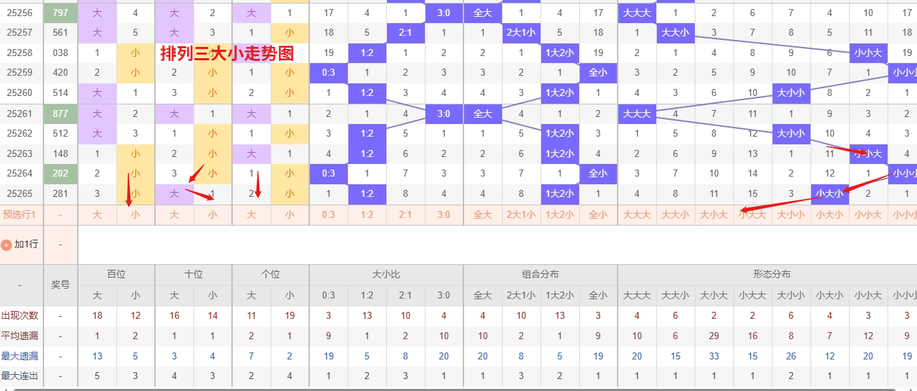 排列三 大小形态分析:从大小走势图上可以看出排列三100期内百位大小比约为55比45,十位大小比约为49:51,个位大小比约为53比47,除了十位奇数比偶数多,百位和个位是偶数比奇数多。历史数据近2期开出小大小下一期的走势为,第184期开出小大小第185期开大小大。第197期开出小大小后第198期开大小小,第201期开出小大小后202期开小大大。近期排列三大小走势分析,“大小大”组合已持续多期未见,遗漏值逐步攀升至偏冷区间,形成明显的冷态特征。按照概率均衡原则,该组合已积累了一定的回补动能,近期需密切关注其解冻信号。与此同时,“大小小”组合正呈现热出态势,频繁开出显示其仍处于强势周期,所以排列三第2025266期大小形态推荐大小大防大小小。