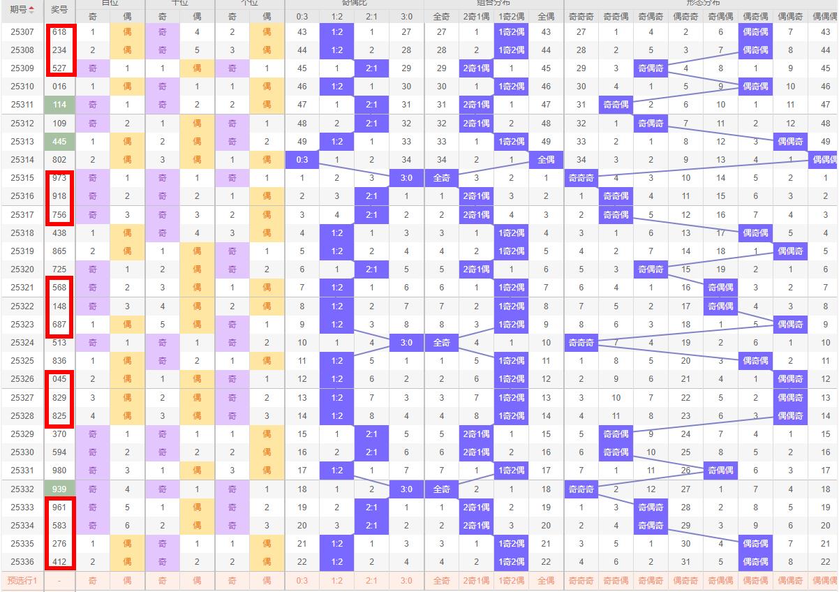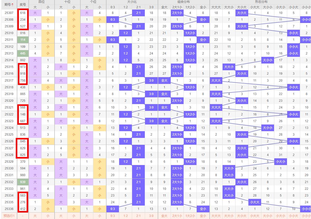 大小走向分析 根据336期开奖号码412,可以看到大小形态为小小小。在最近的走势中,大小号码开出比例基本持平。因此,对于337期,可以预判大小号码继续维持均衡状态,关注大小比1:2的组合。近十期大小比为17:13大数占据优势防两小一大