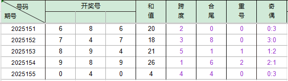 2025151期开奖号码686,我们可以看出近30期百位6出现1次(较155期减一),十位8出现4次,个位6出现3次。