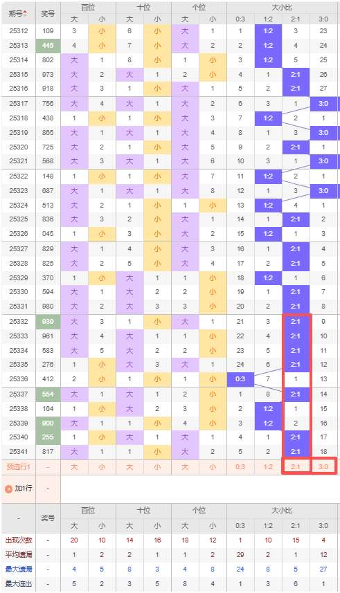 上期大小比:2:1,近10期大小比出现情况:2:1、2:1、2:1、2:1、0:3、2:1、1:2、1:2、2:1、2:1,最近10期出7期2:1,出现2期1:2,出现1期0:3,出现0期3:0,根据近10期出号规律本期推荐遗漏18期出3:0,防三连出2:1,综上所述大小比推荐:防:2:1,重点关注:3:0。