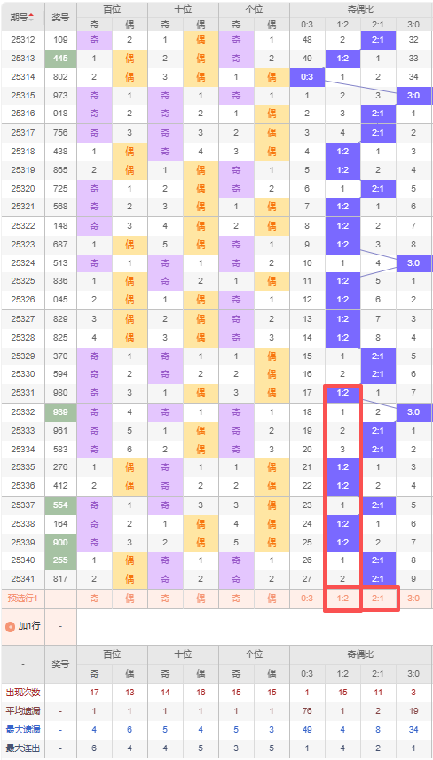 上期奇偶比:2:1,近10期奇偶比出现情况:3:0、2:1、2:1、1:2、1:2、2:1、1:2、1:2、2:1、2:1,最近10期出现5期2:1,出现4期1:2,出现0期0:3,出现1期3:0,根据近10期出号规律本期推荐遗漏2期出1:2,防三连出2:1,综上所述奇偶比推荐:防:2:1,重点关注:1:2。