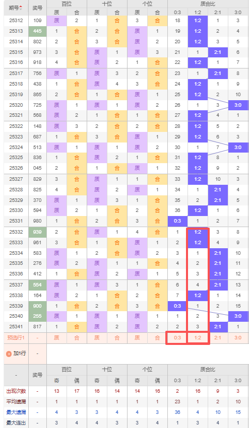 上期质合比:2:1,近10期质合比出现情况:1:2、1:2、2:1、2:1、2:1、2:1、1:2、0:3、3:0、2:1,最近10期出现5期2:1,出现3期1:2,出现1期0:3,出现1期3:0,根据近10期规律本期推荐遗漏2期的0:3,防遗漏3期的1:2,综上所述质合比推荐:防:1:2,重点关注:0:3。