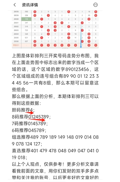 上图是体彩排列三号码分析文章的截图,我最后定的胆码和8码全部猜对。