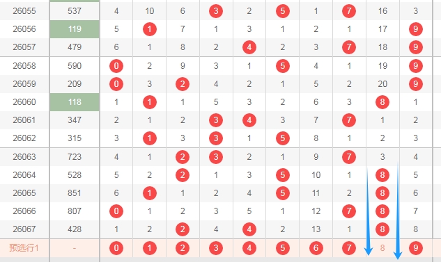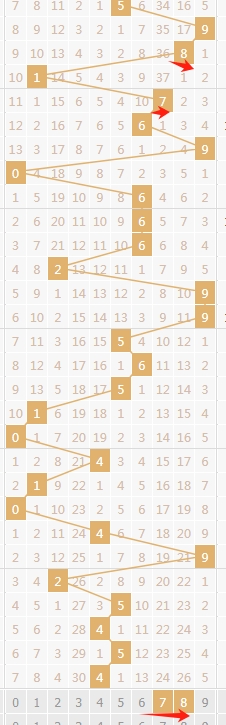 上图是体彩排列三开奖号码走势分布图,我在上面走势图中标志出来的数字都是遗漏周期大的数字369,因为上期开出的数字8遗漏周期是0,最近三期数字8的遗漏周期都是0,那么前面出遗漏周期小的数字,那么后面就有可能出遗漏周期大的数字,关注数字369出一个或者两个。