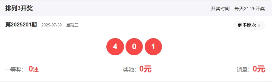 排列三第2025201期开奖回顾:开奖号码:401 形态:组六