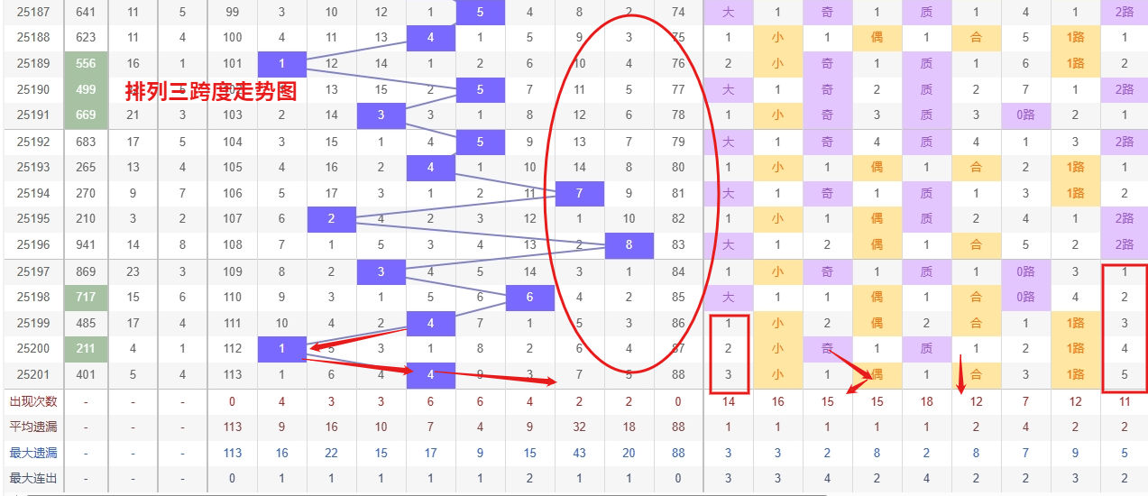 排列三 跨度分析:从上图可以看出近100期的跨度大小比约为48比52,跨度奇偶比约为55比45总体来看还是比较均衡的,但跨度大小之间有点差异。我们再从历史开出4跨后下一期8跨度数据来做参考。最近10期跨度大小比约为6:4近期开出大数跨度过多返回小数跨度的概率更高一点。历史开奖近2期出4跨以后的走势为107期开出4跨后下一期走8跨走出4振幅,第125期开出4跨后下一期走6跨走出2振幅第133期开出4跨后下一期开出2跨走出2个振幅。连续多期小振幅。近期排列三跨度走势呈现明显的冷热分化,其中7跨和9跨持续低温,成为当前最值得关注的冷门跨度。特别是9跨已经遗漏长达88期未出,远超历史平均遗漏值,进入深度冷态阶段,回补需求极为强烈,近期极有可能迎来解冻反弹;7跨同样多期未见,同样存在较强的回补预期,需要重点防守。而6跨则表现异常活跃,近期频繁开出,呈现明显热态特征,短期内仍有连开可能,但也要警惕热极必反的风险。采取"冷热兼顾"的思路,对长期遗漏的9跨和7跨进行重点防守,同时适当跟进6跨的短期热势, 综合以上分析后得出,本期预计跨度遵从历史会走出小振幅,出4跨度后容易走出1到4个跨度振幅的对称形态,跨度走出1到4个振幅看好的跨度有2679跨,所以第2025202期排列三跨度推荐2679跨。本文由一起彩钱是生命动力所著,请勿转载