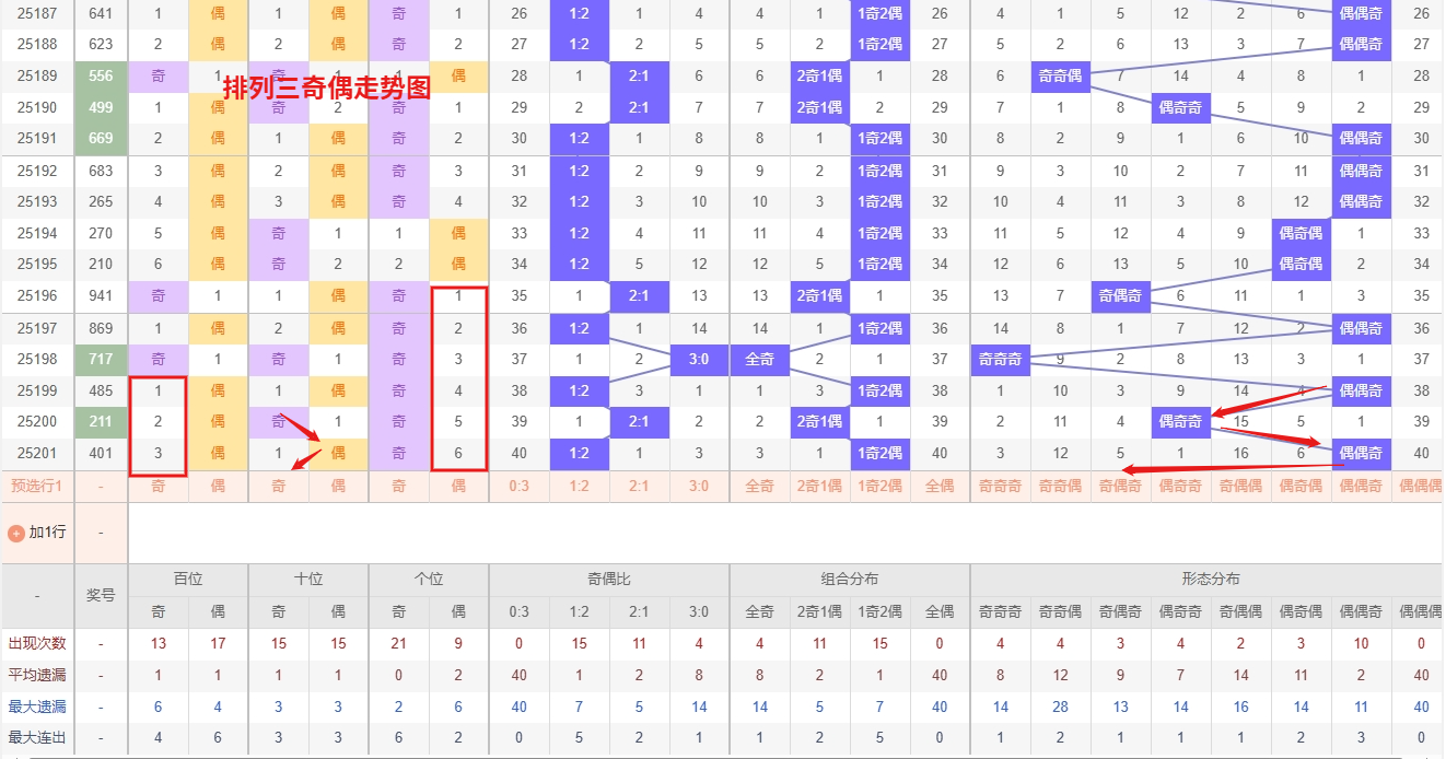 排列三 奇偶分析:从上图可以看出排列三100期内百位奇偶比约为52比48,十位奇偶比为54比46,个位奇偶比为47比53,百位的比值比较均衡,但是十位的比值偏差就有点大,历史奇偶形态近2期开出偶偶奇后下一期的走势为,第115期开出偶偶奇后116期开奇奇偶, 第125期开出偶偶奇后第126期开偶偶偶,第137期开出偶偶奇后第138期开奇偶偶。近期排列三奇偶走势呈现明显分化,奇奇偶组合持续走热,连续多期高频开出,短期内仍有连开可能,可适当跟进但需警惕热态转折。而偶偶偶组合则陷入深度冷态,已遗漏超过理论周期,回补需求强烈,需重点防守。从历史数据来看,奇奇偶组合的热出往往伴随着偶偶偶组合的蓄力,当前这种极端分化格局预示偶偶偶组合可能迎来解冻时机。采取"追热防冷"的投注策略,在关注奇奇偶连开趋势的同时,对长期遗漏的偶偶偶组合进行针对性防守,所以排列三2025202期奇偶形态推奇奇偶与偶偶偶。本文由一起彩钱是生命动力所著,请勿转载