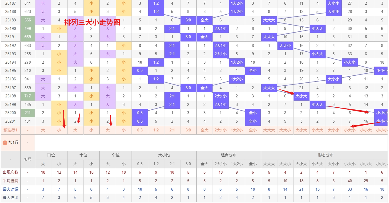 排列三 大小形态分析:从大小走势图上可以看出排列三100期内百位大小比约为45比55,十位大小比约为47:53,个位大小比约为54比46,除了百位和十位奇数比偶数多,个位是偶数比奇数多。历史数据近2期开出小小小下一期的走势为,第105期开出小小小第106期开大小大。第118期开出小小小后第119期开小小大,第122期开出小小小后123期开小大小。近期排列三大小形态呈现明显分化,其中"大小大"和"小小大"组合持续低温,成为当前需要重点关注的冷门形态。"大小大"组合已遗漏多期未出,超出历史平均遗漏值,回补需求逐渐累积;而"小小大"组合同样进入冷态周期,遗漏期数逼近临界点,随时可能迎来反弹。从历史走势来看,大小形态往往呈现冷热交替的规律,当特定组合长期遗漏后,往往会迎来集中回补期。对这两个冷门组合进行重点防守,可采用"守冷待热"的战术, 所以排列三第2025202期大小形态推荐大小大防小小大。本文由一起彩钱是生命动力所著,请勿转载