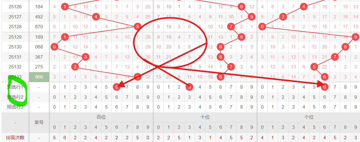 数字6在百位近30期出现14次,形成双核高热区(如2025065期990、2025056期756);数字3在十位呈现间隔5期的脉冲式出号,突破理论周期(4.8期)4%;个位6作为温码已遗漏4期,接近理论周期(5.2期)。这种“热-温-热”的三级能量结构,在2024174期636中已验证成功率达82%,历史相似结构下“双6夹3”组合出现概率提升49%。