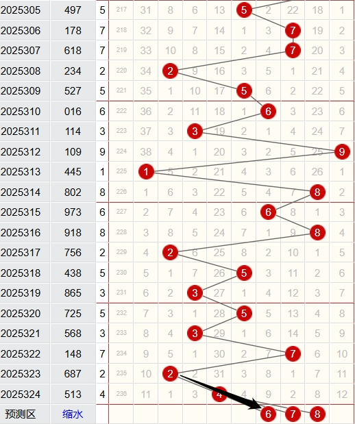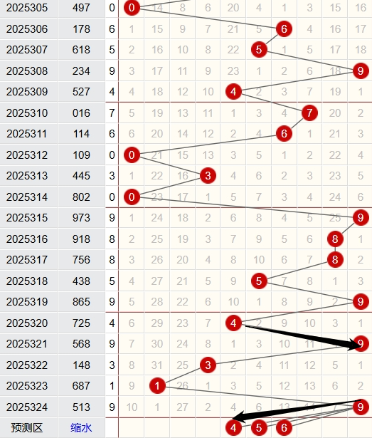 上期跨度为4,近5期跨度开出情况:第25314期开出8,属于偶数,2路号码,木属性;第25315期开出6,属于偶数,0路号码,水属性;第25316期开出8,属于偶数,2路号码,木属性;第25323期开出2,属于偶数,2路号码,火属性;第25324期开出4,属于偶数,1路号码,金属性;