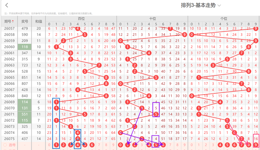 上一期百位开出号码为4,为偶数、小数、合数、1路号码:近10期百位较少开出09等号码,本期百位大概率仍然不会开出09等号码,本期百位选号时可以优先排除09等号码,结合上述走势图看,本期百位看好123456等号码。